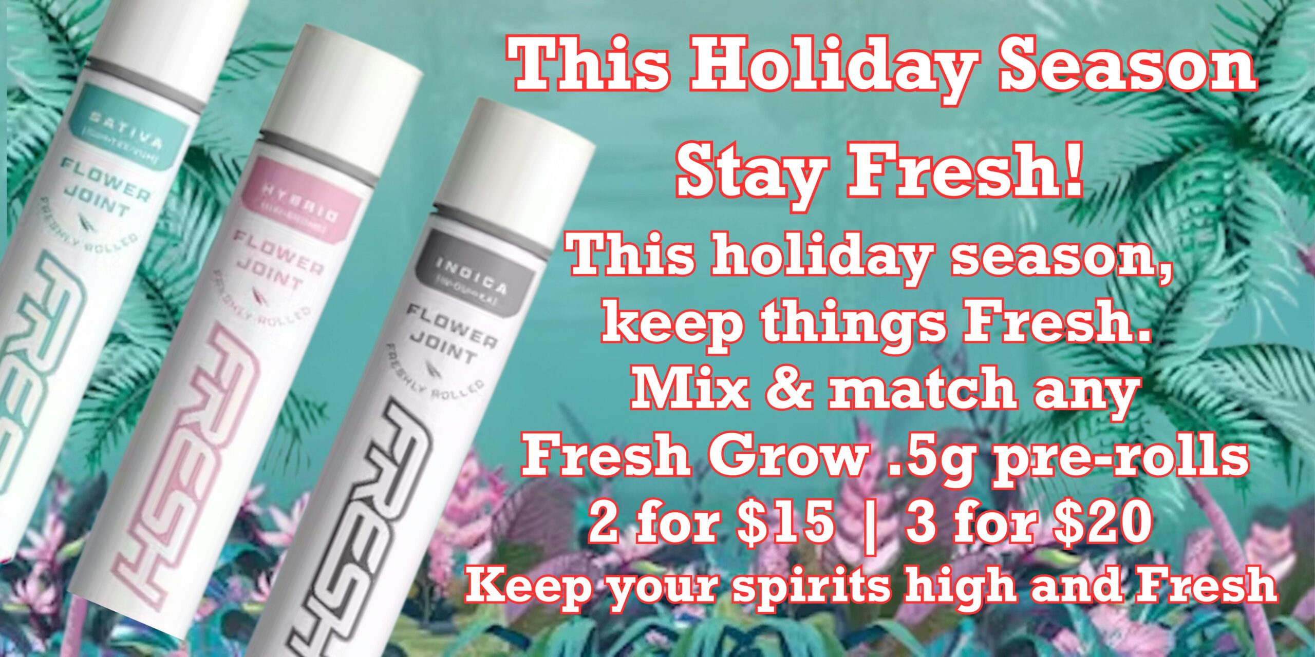 Keep your spirits high and your rolls Fresh! Your favorite Fresh Grow .5g pre-rolls are holiday-ready: 2 for $15 | 3 for $20
